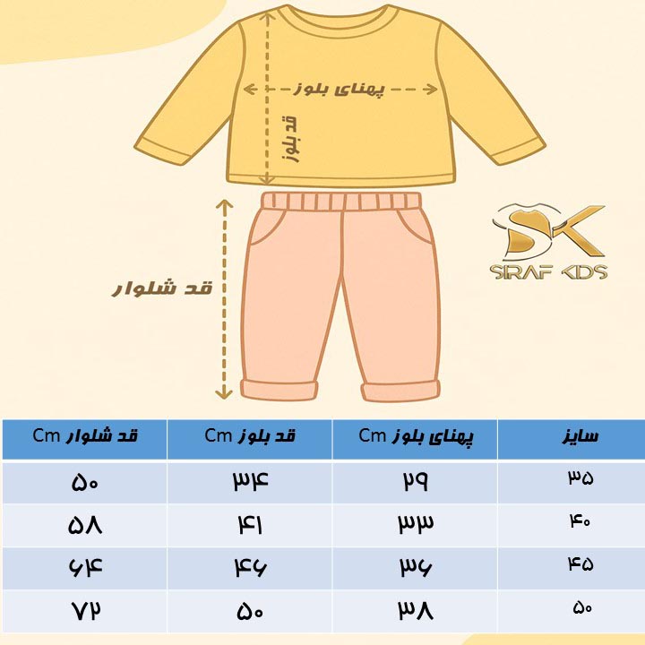 پهنای بلوز 33 سانت ، قد بلوز 41 سانت ، قد شلوار 58 سانت